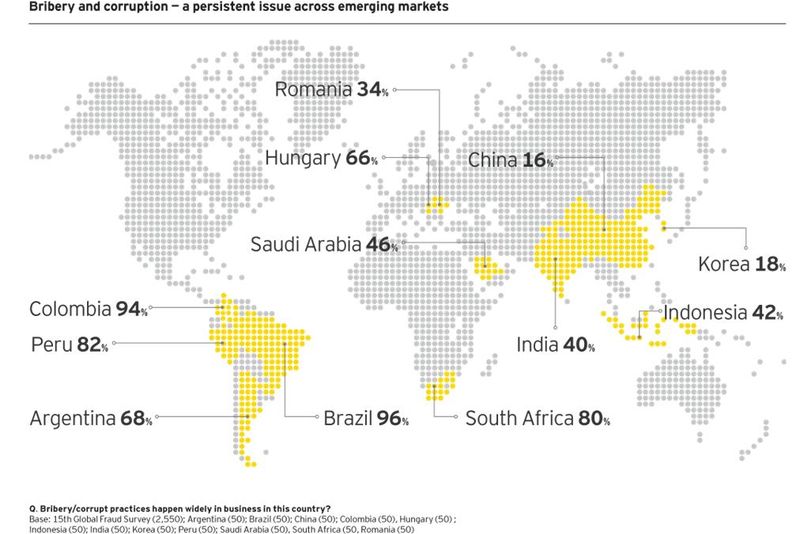 Conform unui studiu EY, care sondează percepția privind situațiile de fraudă în piețele emergente, printre care și România, 42% dintre repondenţi consideră că frauda și corupția reprezintă unele dintre cele mai mari riscuri pentru afacerile lor, față de 29% din piețele dezvoltate. Peste 52% dintre participanții chestionați consideră că practicile legate de corupție sunt mai răspândite pe piețele emergente, unde se produc pe scară largă, comparativ cu 20% pe piețele dezvoltate.Comparativ cu datele din ediția din 2012, nivelurile percepute de mită și corupție pe piețele emergente s-au dublat față de cele de pe piețele dezvoltate. Având în vedere creșterea nivelului de reglementare, eforturile de punere în aplicare și de respectare a conformității pe piețele emergente, este îngrigorător faptul că acest decalaj nu s-a redus, spun realizatorii studiului EY.