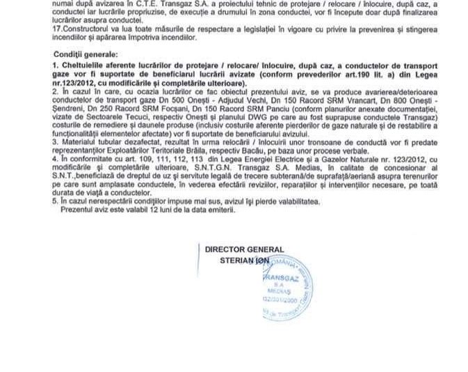 "Suntem în posesia avizului integral de la Transgaz în care se spune că document se spune că în zona de protecție a conductei se vor efectua cu mare atenție lucrările,
