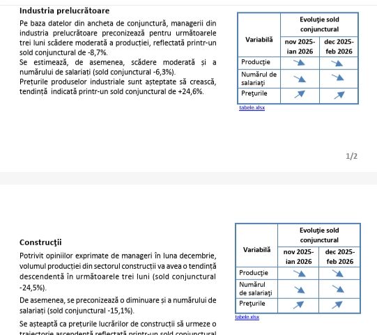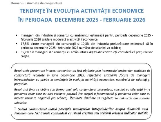 Potrivit analizei INS - TENDINȚE ÎN EVOLUȚIA ACTIVITĂȚII ECONOMICE ÎN PERIOADA DECEMBRIE 2025 - FEBRUARIE 2026, managerii din industrie și comerțul cu amănuntul estimează o scădere moderată a activității în următoarele trei luni. În paralel, 17,5% dintre managerii din construcții și 10,3% din industria prelucrătoare se așteaptă la reducerea numărului de salariați – un semnal clar că firmele intră în fază defensivă.