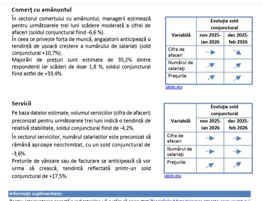 Politicile de austeritate promovate în ultimele luni de guvernul Bolojan încep să fie resimțite în economie. O analiză a Institutului Național de Statistică arată o deteriorare vizibilă a activității economice si a perspectivelor pentru perioada decembrie 2025 – februarie 2026, însoțită de scăderi ale numărului de angajați și de creștere a inflației.