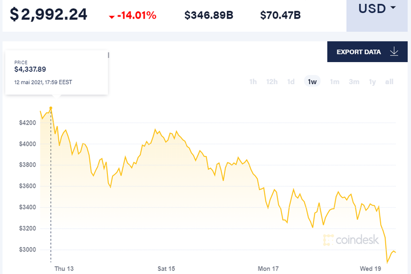 Ethereum, a doua cea mai importantă criptomonedă, s-a depreciat abrupt, în interval de o săptămână, cu peste 30%, de la valoatrea de 4.337 dolari pe 12 mai la puțin peste 2.900 de dolari, miercuri dimineață.