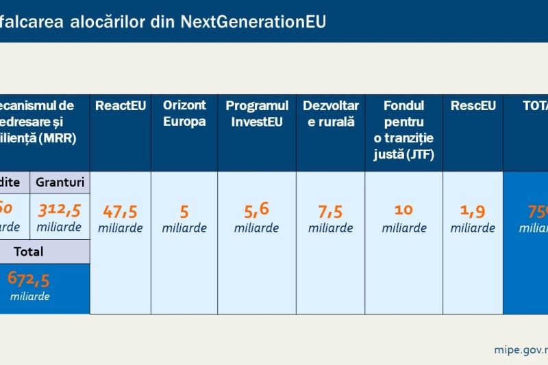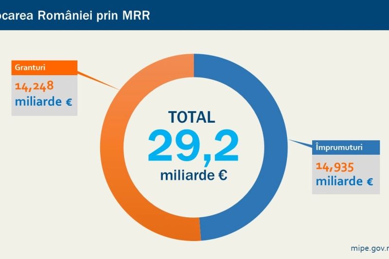 Prin PNRR, România are la dispoziție 29,2 miliarde euro, până în 2026, pentru modernizare prin reforme și investiții esențiale. Din suma totală, 14,2 miliarde euro sunt granturi și 14,9 miliarde sunt împrumuturi. Banii se vor acorda în tranșe, în funcție de îndeplinirea unor obiective, numite jaloane și ținte. În total, sunt 507 de jaloane și ținte de realizat până la 31 decembrie 2026.Planul Național de Redresare și Reziliență a fost adoptat de Comisia Europeană în data de 27 septembrie 2021.Mai exact, în total, România ar primi 14,248 miliarde sub formă de grant și aproximativ 14,935 miliarde sub formă de împrumuri pentru un total de 29,2 miliarde euro.Regula stabilită prin propunerea de Regulament (aflată încă în negociere la nivel european) este ca 70% din granturi să fie angajate până la finalul anului 2022, termenul limită pentru accesarea diferenței de 30% din granturi fiind 31 decembrie 2023. În plus, plățile pentru proiectele care vor fi incluse în programele naționale de redresare și reziliență trebuie făcute până în decembrie 2026.