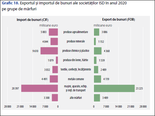 de 12, 610 miliarde de euro, în timp ce importurile de servicii au însumat 6, 882 miliarde de euro. Astfel, comerțul internațional cu servicii al societăților ISD a consemnat un excedent în valoare de 5, 728 miliarde de euro. Ponderea întreprinderilor ISD în totalul