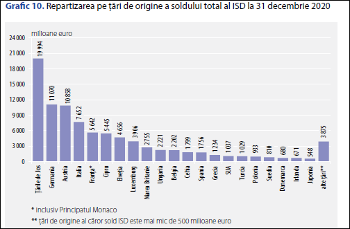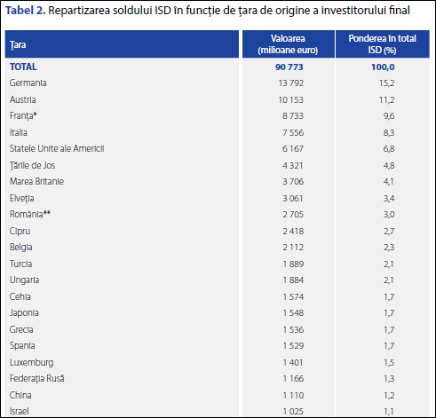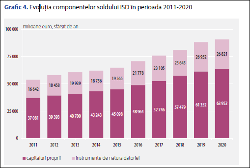 Până acum, România a acumulat 91 de miliarde de euro ca investiții străine directe (ISD). 64 de miliarde de euro (peste 70% din stocul de investiții străine) reprezintă capitalurile companiilor străine, inclusiv profitul reinvestit, iar 27 de miliarde de euro reprezintă creditele pe care investitorii le-au acordat companiilor pe care le-au înființat la noi în țară.