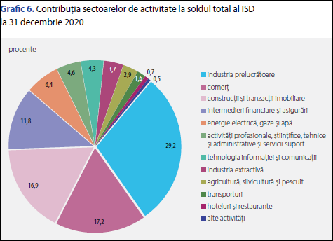 Am fost, din păcate, pe o tendință negativă în ultimii doi ani, de la maximele din 2018.Dacă ne referim la tot stocul de investiții străine, iată cum se structurează acesta pe ramuri de activitate: