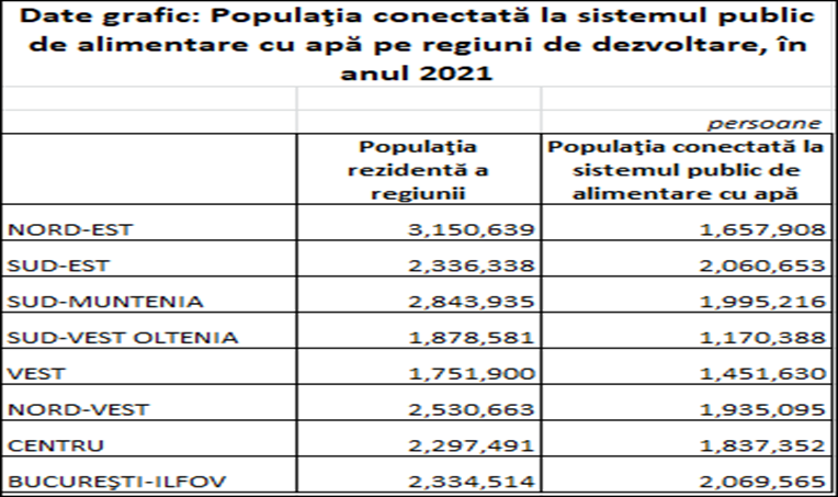 Și aici constatăm aceeași discrepanță: în București-Ilfov avem peste 88% din populație conectată la rețeaua de apă, în vreme ce în Moldova doar 52% din populație are acces la alimentarea cu apă. În Muntenia ponderea populației cu acces la apă curentă atinge 70%, în Dobrogea ajunge tot la procentajul capitalei- 88%, în Oltenia la 62%, în Transilvania la 80%, în Vest la aproape 83% și în Nord-Vest la 76%.