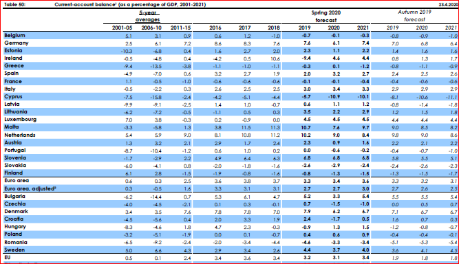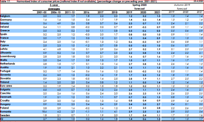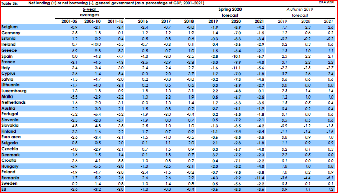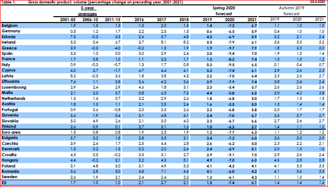 Economia Uniunii Europene se va contracta cu 7,4% în 2020, cea a marii Britanii cu 8,3%, în vreme ce Statele Unite vor avea parte de o cădere ceva mai „blândă” , de doar 6,5%, Japonia de una și mai „blândă”, cu o contracție de 5%; China și India vor avea creșteri mici de 1 respectiv 1,1%, Rusia va cunoaște o contracție de 5%, ceva mai mică decât cea a Braziliei (-5,2%). La scară planetară, economia se va restrânge cu 3,5%. Practic, dintre toate economiile majore ale globului, Uniunea Europeană va pierde cel mai mult, de peste două ori mai mult decât media mondială. Dar, crede Comisia Europeană, doar China și India vor recupera mai rapid în 2021: adică Uniunea va avea o creștere de 6,1% în 2021, SUA de 4,9%, Japonia de 2,7%, China de 7,8%, India de 6,7%, Rusia de 1,6% și Brazilia de 1,9%.Zona Euro va fi afectată mult mai sever, cu o contracție de 7,7% în 2020. Grecia, Italia Spania și Croația vor avea cel mai mult de pierdut (-9,7% din PIB, -9,5% din PIB, -9,4% din PIB, respectiv -9,1% din PIB), adică țările în care turismul are o pondere foarte mare în PIB. Germania, cea mai mare economie a Uniunii va suferi o contracție de 6,5% din PIB, iar următoarea cea mai mare economie, Franța, se va reduce cu 8,2%. Polonia va suferi cel mai puțin din Uniune, cu o contracție de numai 4,3%, urmată de Luxemburg (-5,4%), Austria (-5,5%), Malta (-5,8%), Danemarca (-5,9%) și România (-6%). PIB-ul Cehiei se va contracta cu 6,2%, al Ungariei cu 7% și al Bulgariei cu 7,2%.În ceea ce privește revenirea de anul viitor, campioni vor fi grecii (+7,9%), urmați de croați (+7,5%), francezi (+7,4%) și spanioli (+7%). Germania va avea o creștere mult mai moderată (de numai 5,9%), iar Italia, cea de-a treia economie continentală ca dimensiune va crește cu un ritm de 6,5% în 2021. În ceea ce privește statele estice, polonezii și românii vor avea parte de creșteri cu pante mai reduse (4,1%, respectiv 4,2%), întrecuți de unguri și bulgari ( câte 6% creștere) și cehi (5% creștere). Pe ansamblu, revenirea din 2021 va fi mai accentuată în zona Euro (+6,3%) va fi ceva mai accelerată decât media întregii Uniuni (+6,1%). Ungaria, România și Polonia vor fi campionii Uniunii Europene la creșterea indicelui prețurilor de consum (3%, respectiv câte 2,5% în 2020, departe de media zonei Euro (1,1%) și a Uniunii în ansamblul său (1,3%). În 2021, România va avea cea mai mare creștere a prețurilor de consum (3,1%), urmată de Polonia (2,8%) și Ungaria (2,7%). Prin contrast, Irlanda, Grecia, Italia și Portugalia vor avea parte de scăderi de prețuri în 2020, urmate de creșteri ușoare (sub sau ușor peste 1%) în anul următor. Bulgaria, Grecia și România vor avea cele mai importante scăderi de populație în 2020 (0,7%, respectiv câte 0,6%), în vreme ce în 2021, România, Bulgaria și Letonia vor fi împreună la vârfu pierderilor de populație, cu pierderi de 0,7% din totalul cetățenilor.Rata șomajului va atinge 6,5% în anul 2020 în România și va scădea la 5,9% în 2021, departe de campioanele Grecia (șomaj de 20% în 2020), Spania (șomaj de 19% în 2020), dar și sub Ungaria sau Polonia (7%, respectiv 7,5%). Cele mai stabile piețe se vor dovedi Germania (4% șomaj în 2020) și Cehia (5% șomaj în 2020).Cheltuielile bugetare în România vor atinge 41,5% din PIB (penultima cea mai mare pondere din Uniune, după Irlanda), mult sub Ungaria și Polonia (câte 50,3% din PIB) și departe de cele 54% din PIB (media UE). Veniturile vor respecta și ele aceeași ierarhie, cu România având a doua cea mai mică pondere în PIB (32,3%), după Irlanda. Suntem, evident, departe de media UE (46,4%), dar și de Polonia(40,8%) și Ungaria (45,1%).Și-așa ajungem și la cea mai dureroasă chestiune: deficitul bugetar. România va avea în 2020 al cincilea cel mai mare deficit bugetar din UE (-9,2% din PIB), după Italia, Spania, Franța și Polonia. Această problemă se va acutiza dramatic în 2021, cu România ajungând campion absolut al deficitului bugetar al Uniunii : -11,4% din PIB! Asta, în contextul unei medii continentale de numai 3,6% pe 2021. Și vom fi la ani-lumină de Polonia și Ungaria (-3,8%, respectiv-4%). Și, dacă anul acesta vom ajunga cu datoria publică la o pondere de 46,2% din PIB, la anul vom fi deja la un nivel de 54,7% din PIB. Deficitul de cont curent al țării (3,3% în 2020 și 3,4% în 2021) ne plasează pe poziția a doua din UE, după mărimea absolută.