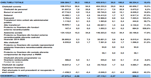 Ei bine, creșterea asta economică a adus bugetului mai mulți bani, 70 de miliarde de lei mai precis în plus, adică o creștere a veniturilor bugetare de 22,7%, de la 308 miliarde de lei anul trecut la 378 miliarde de lei anul acesta. Toți cei 70 de miliarde de lei strânși în plus s-au/se vor cheltui, avem așadar și o creștere a cheltuielilor de aproape 20%, de la 356 de miliarde de lei la 426 miliarde de lei.