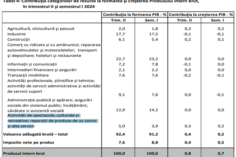 Pe ansamblul economiei, valoarea adăugată brută totală (adică ceea ce se împarte ca salarii și profituri în economie) a crescut doar cu 0,2% în primul semestru al anului 2024 față de semestrul similar din 2023. Și-atunci de unde ne vine cifra de +0,7% creștere de PIB pe primele șase luni? Ar fi de râs, dacă nu ar fi de plâns, dar cea mai mare contribuție la creșterea economică o au ....impozitele pe produs, adică TVA și accize, care , cu doar 8,8% pondere în PIB, au adus o contribuție de 0,5% la creșterea PIB-ului semestrial.