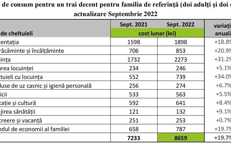 COȘ minim de consum lunar pentru un trai decent - România, septembrie 2022