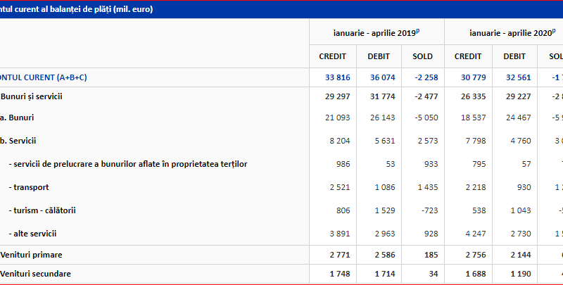 Banca Națională a publicat raportul privind balanţa de plăţi şi datoria externă – aprilie 2020. Astfel, În perioada ianuarie - aprilie 2020, contul curent al balanţei de plăţi a înregistrat un deficit de 1 782 milioane euro, comparativ cu 2 258 milioane euro în perioada ianuarie-aprilie 2019; în structură, balanţa bunurilor a consemnat un deficit mai mare cu 880 milioane euro, balanța serviciilor a înregistrat un excedent mai mare cu 465 milioane euro, balanța veniturilor primare a înregistrat un excedent mai mare cu 427 milioane euro, iar balanța veniturilor secundare a înregistrat un excedent mai mare cu 464 milioane euro.