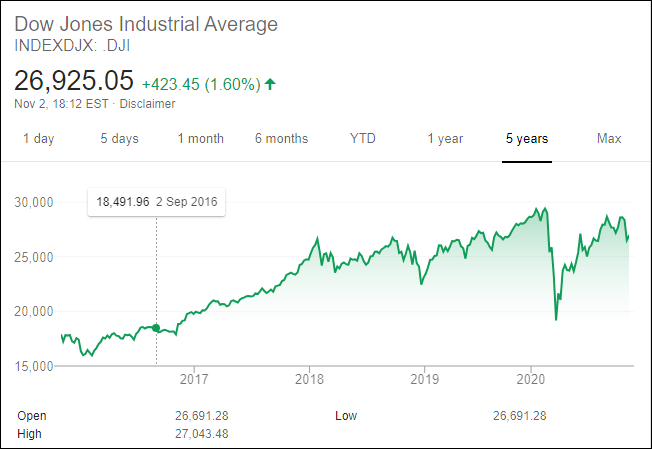 Bursa- indicatorul cel mai sensibil al sănătății economiei americane este într-o revenire puternică după șocul COVID-19 din primăvară. Indicele Dow Jones a depășit, marți, valoarea de 27 000 puncte, față de 19 827 puncte, la preluarea mandatului de către Donald Trump. Adică o creștere de 36%