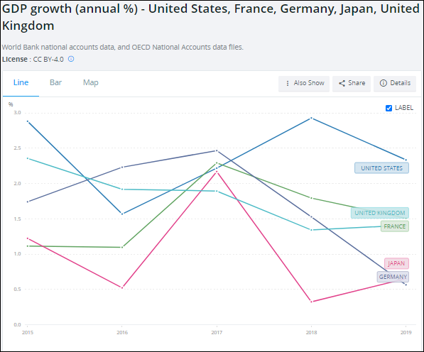 https://data.worldbank.org/indicator/NY.GDP.MKTP.KD.ZG?end=2019&locations=US-FR-DE-JP-GB&start=2015La fel se poate spune și despre șomaj, indicator la care SUA au atins în timpul administrației Trump cel mai scăzut nivel de după război, nivel care este mai bun decât al lumii occidentale în ansamblu, dar încă ușor peste nivelul Germaniei sau Japoniei: