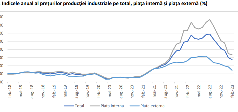 A treia mare sursă de îngrijorare din piață o reprezintă inflația industrială, adică la poarta fabricii, care, deși și-a redus amplitudinea la o treime față de vârful de anul trecut, indică, în continuare, scumpiri de peste 21% an-la an ale produselor industriale: