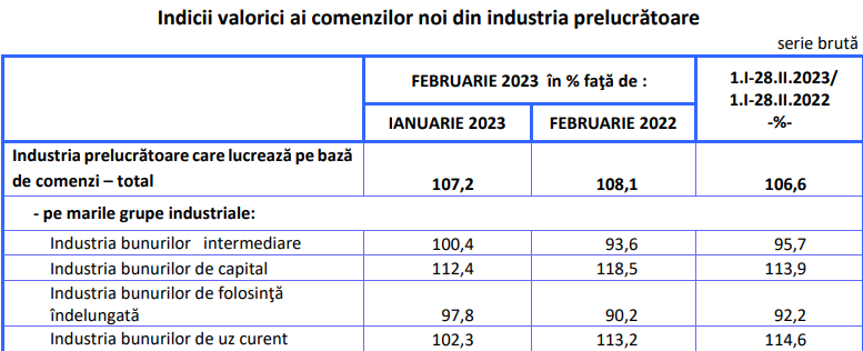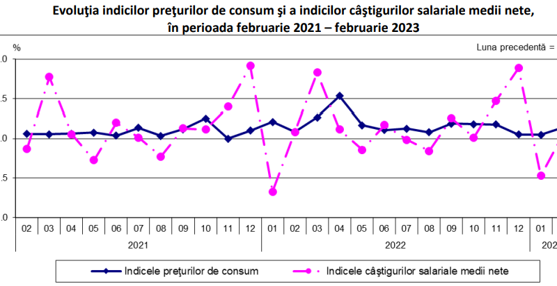 În ciuda unui consum mai mic decât în perioada corespondentă a anului trecut, statistica ne arată că puterea de cumpărare s-a cam păstrat pentru ramura cea mai activă a populației: salariații. Asta dacă luăm în considerare o creștere a salariului mediu februarie2023 față de februarie 2022 de 14,8% și o inflație de cam 15%. salariul de anul acesta este cam același (99,4%) ca cel de acum un an. dacă această constatare este adevărată, înseamnă că reducerea mare a consumului vine din consumul intermediar, adică cel făcut tocmai în vederea producerii bunurilor și serviciilor. Deci populația suferă mai puțin, iar firmele sângerează rău- cam asta este concluzia acestei statistici: