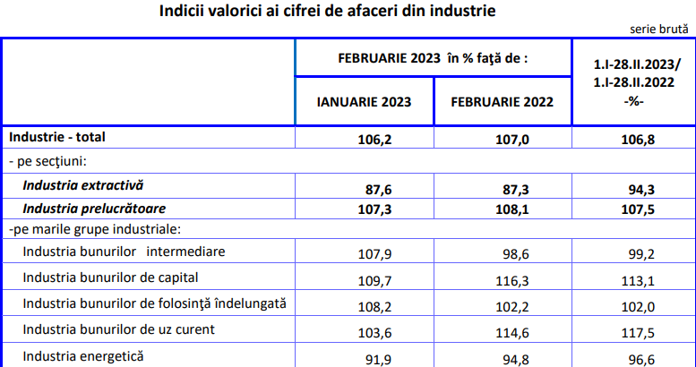 Iar cifra de afaceri din industria românească (total piață internă și externă) a crescut cu 6,8% în contextul aceleiași inflații industriale de peste 21%. pierdem volume importante în sectoarele productive: