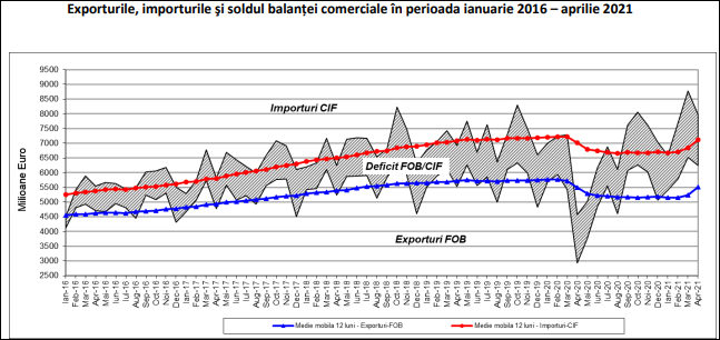 Deficitul balanţei comerciale (FOB/CIF) în perioada primelor patru luni din 2021 a fost de 7,06 miliarde euro, mai mare cu 957,5 milioane euro decât cel înregistrat în perioada corespunzătoare a anului trecut, 1.I-30.IV 2020. În ritmul acesta, la sfârșitul anului vom contabiliza un deficit la comerțul internațional cu bunuri de peste 21 de miliarde de euro!În luna aprilie 2021, exporturile FOB au însumat 6248,9 milioane euro, iar importurile CIF au însumat 7977,0 milioane euro, rezultând un deficit de 1728,1 milioane euro. Faţă de luna aprilie 2020, exporturile din luna aprilie 2021 au crescut cu 113,2%, iar importurile