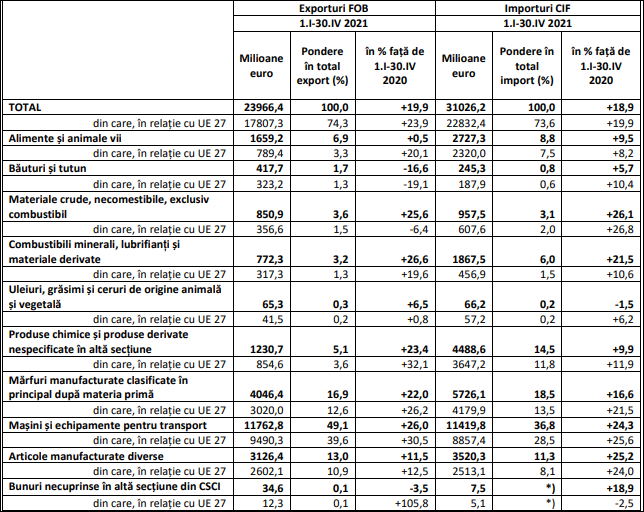 au crescut cu 74,6%.În perioada 1.I-30.IV 2021, exporturile FOB au însumat 23966,4 milioane euro, iar importurile CIF au însumat 31026,2 milioane euro. ceea ce înseamnă că în perioada respectivă(1.I-30.IV 2021), exporturile au crescut cu 19,9%, iar importurile au crescut cu 18,9%, comparativ cu perioada 1.I-30.IV 2020.