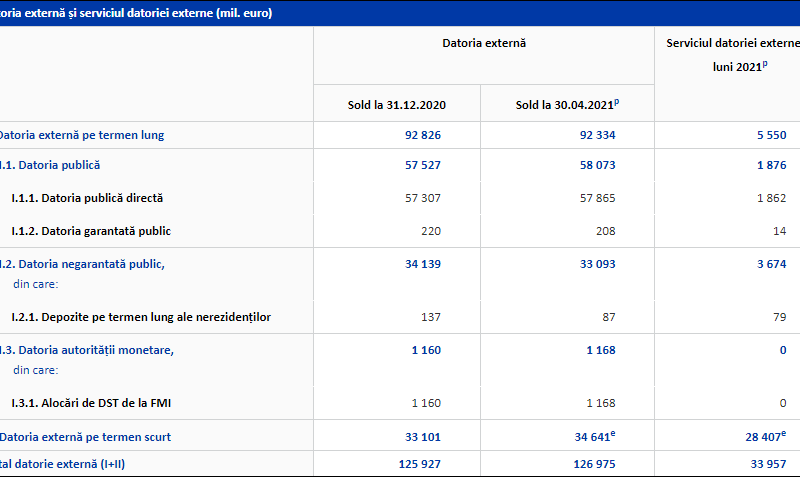 Înrăutățitrea situației datoriei de la an la an se vede și din faptul că gradul de acoperire a importurilor de bunuri și servicii la 30 aprilie 2021 a fost de 5,0 luni, în comparație cu 5,6 luni la 31 decembrie 2020, iar gradul de acoperire a datoriei externe pe termen scurt, calculată la valoarea reziduală, cu rezervele valutare la BNR la 30 aprilie 2021 a fost de 86,8 la sută, comparativ cu 90,7 la sută la 31 decembrie 2020.