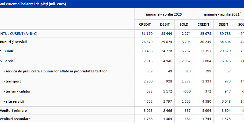 https://bnr.ro/page.aspx?prid=19536Cea mai mare contribuție la acest deficit enorm o are deficitul de comerț exterior cu bunuri (7,2 miliarde de euro), foarte ușor îndulcit de execdentul de la comerțul exterior cu servicii (2,85 miliarde de euro).De altfel, deficitul de la comerțul cu bunuri a crescut în primele patru luni ale lui 2021 cu 1 miliard de euro, iar excedentul de la servicii s-a redus ușor cu 100 de milioane de euro, față de perioada ianuarie-aprilie 2020.Avem, de asemenea, o înrăutățire a balanței veniturilor primare care devine negativă pe primele patru luni din 2021 (-510 milioane de euro) față de plusul de 557 milioane de euro din aceeași perioadă din 2020.În continuare, singurele vești bune vin din sectorul transporturilor (excedent de peste 1,3 miliarde de euro) și din cel al sectorului de prelucrare a mărfurilor (toate variantele de lohn), unde avem un excedent de 750 de milioane de euro. Serviciile, în general, compensează ușor imensul dezechilibru de la bunuri.