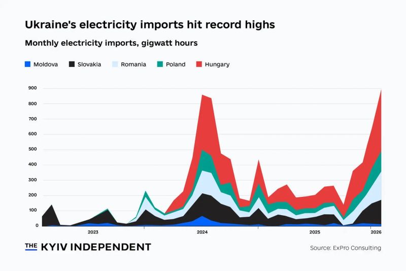 Ucraina a importat în ianuarie un volum record de energie electrică – 900 GWh, cu 40% mai mult decât în decembrie 2025, ca urmare a atacurilor masive ale Rusiei asupra infrastructurii energetice, în condițiile unei ierni extrem de dure. Ungaria a fost de departe principalul furnizor, asigurând aproape jumătate din totalul importurilor Ucrainei, în timp ce România și Republica Moldova, împreună, au livrat mai puțin de jumătate din cât a furnizat Budapesta.