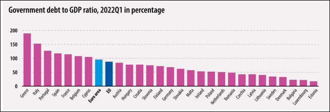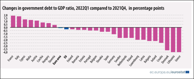 sursa: https://ec.europa.eu/eurostat/documents/2995521/14644644/2-21072022-AP-EN.pdf/ce72169d-1c4a-076c-d9da-4e87577a18dd?t=1658388869931De unde datoria Greciei depășea cu mult pragul de 200% din PIB, acum se înscrie cuminte pe la 190%, iar a Italiei ajunge „doar” la 152%. În continuare statele mediteraneene sunt campioane europene la datorii, toate figurând cu ponderi de peste 100% din PIB, inclusiv Franța: