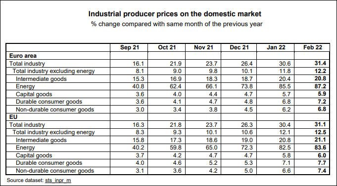 https://ec.europa.eu/eurostat/documents/2995521/14442493/4-06042022-AP-EN.pdf/04a4bf35-787f-a5d5-8edb-dc9e15fd421f?t=1649226810380După cum se vede și din graficul alăturat, avem o explozie a prețurilor industriale , care a început în primăvara anului 2021 și care nu se mai domolește. Și dacă creșterea prețurilor industriale din afara domeniului energiei a fost de aproximativ 20%, creșterea prețurilor industriale din energetică a atins un neverosimil prag de peste 85%!