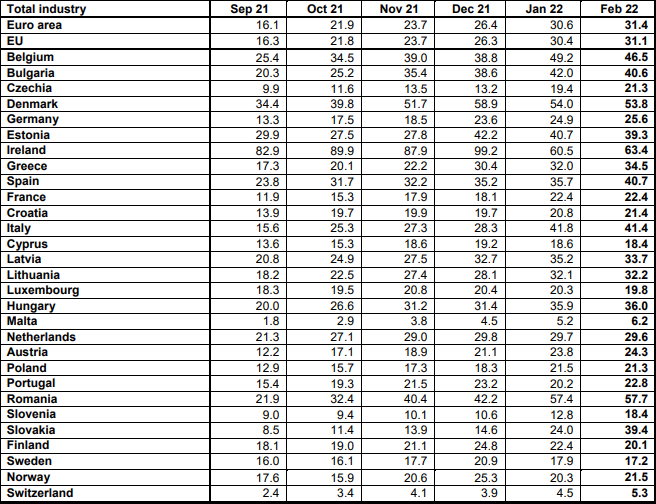 Întreaga uniune Europeană se află sub asediul ratelor mari ale inflației (ale creșterilor prețurilor). Inflație datorată creșterii prețurilor industriale (la poarta fabricii). adică inflația „industrială” se transmite către rafturile de unde ne facem noi cumpărăturile.Numai în luna februarie, înainte de începerea invaziei din Ucraina, prețurile industriale (pe care consumatorii le resimt în prețurile la raft peste 3-6 luni)au crescut cu mai bine de 1 procent față de ianuarie. Dacă ne raportăm la 1 an calendaristic, adică la luna februarie 2021 avem, pe ansamblul Uniunii, o inflație industrială de peste 31%: