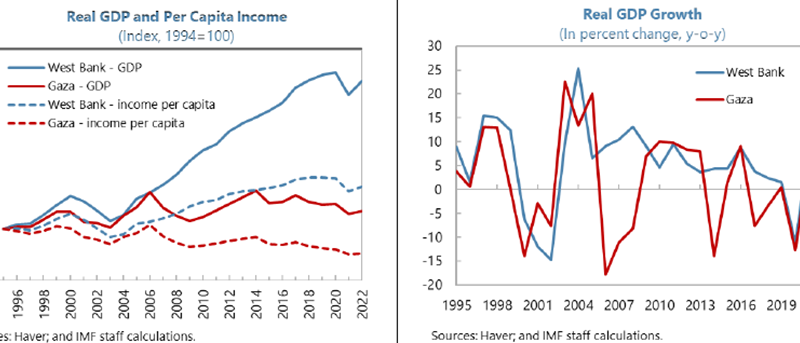Gaza și West Bank trăiesc în două lumi diferite, cu un PIB/locuitor și un venit mediu/locuitor de patru ori mai mari în West Bank decât în Gaza: