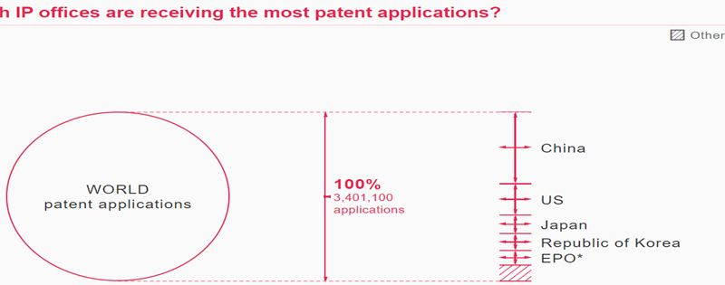 În anul 2010, 27,5% din aplicațiile de patente la nivel global proveneau din America, 19,7% din Japonia, 7,6% din China, iar ponderea statelor europene era semnificativă: 10,5% Germania, 4,4% Franța, 3% Marea Britanie, 1,6% Italia, etc. (sursa: https://www.wipo.int/pressroom/en/articles/2011/article_0004.html ).