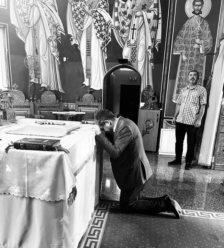 În fotografia alb-negru postată pe pagina sa de Facebook, oficialul apare îngenunchiat în Biserică, adâncit în rugăciune în cea de-a 11-a Duminică după Rusalii.