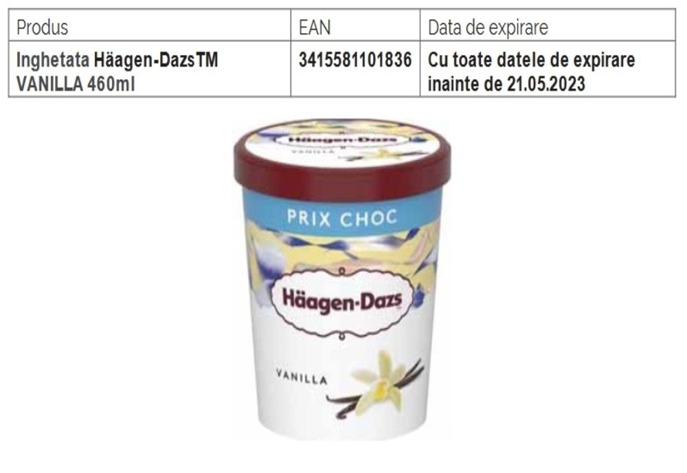 Motivul retragerii: detectărea unor urme de oxid de etilenă (ETO). General Mills, fabricantul Häagen-DazsTM, confirmă că doar produsul de mai jos, cu termen de expirare înainte de 21/05/2023, face obiectul rechemării.