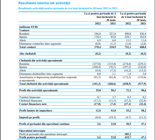 Veniturile companiei (cu excepţia veniturilor între segmente şi alte venituri) pentru perioada de trei luni încheiată la 30 iunie 2022 au fost de 370,4 milioane euro, faţă de 310,9 milioane euro pentru perioada de trei luni încheiată la 30 iunie 2021, o creştere de 19,1%. Veniturile companiei (cu excepţia veniturilor între segmente şi alte venituri) pentru perioada de şase luni încheiată la 30 iunie 2022 au fost de 731,1 milioane euro, faţă de 608,8 milioane euro pentru perioada similară a anului trecut, o creştere de 20,1%.