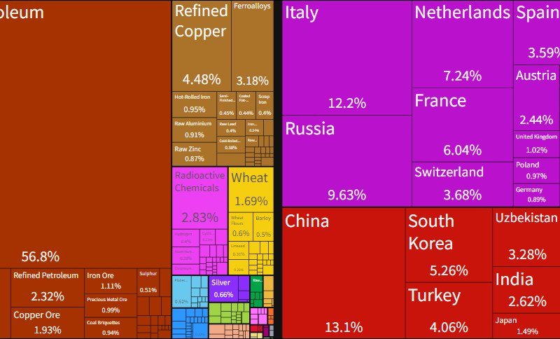 sursa: https://oec.world/en/profile/country/kaz?latestTrendsFlowSelectorNonSubnat=flow0Majoritatea acestui export vital pentru kazahi se face prin intermediul unei conducte cu o capacitate gigantică, de 60 de milioane de tone/anual, care pleacă din câmpul petrolifer Tengiz și ajunge tocmai în portul rusesc de la Marea Neagră Novorossiysk- terminalul Marine 2. Operatorul conductei se numște CPC- Caspian Pipeline Consortium :