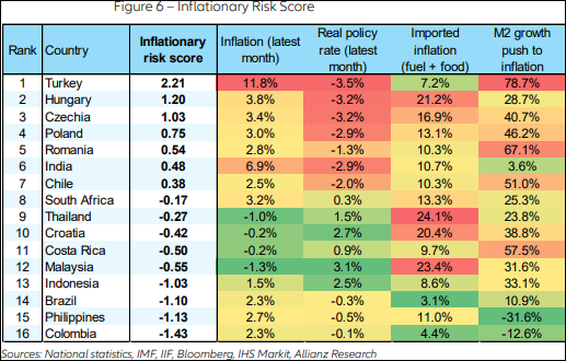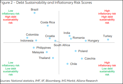 Avem, se observă, rata inflației cea mai mică din regiune, cea mai mică pondere a „inflației importată(combustibil plus alimente), dar cea mai mare creștere a masei monetare M2.Dacă ar fi să dăm o încadrare globală a categoriei de risc a țării noastre, aflăm că ne situăm în cel mai prost sfert de grafic, la categoria „risc mare de inflație, risc mare de nesustenabilitate a datoriei”. E drept, alături de noi stă și Ungaria: