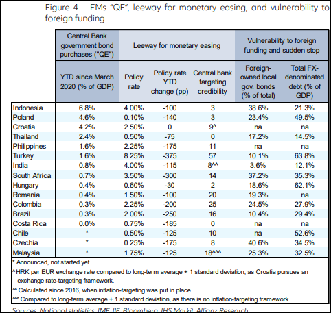 MARKETS: PLAYING WITH FIRE? ”, întocmit de către Euler hermes și Allianz Research. Lucrarea are ca obiectiv înțelegerea riscurilor la care se supun statele emergente adoptând politica financiară a „celor mari” și anume mult-comentata „quantitative easing”, adică pomparea unor lichidități uriașe în economie, prin intermediul băncilor. Această politică, adoptată de către 16 dintre cele mai importante piețe emrgente, presupune atât achiziționarea de obligațiuni de către băncile centrale, cât și injecții de lichiditate în economie, în defavoarea unor reduceri mai agresive ale dobânzii de referință. Iată cum arată tabloul complet al schemelor de intervenție a statelor emergente în cadrul crizei provocată de coronavirus:
