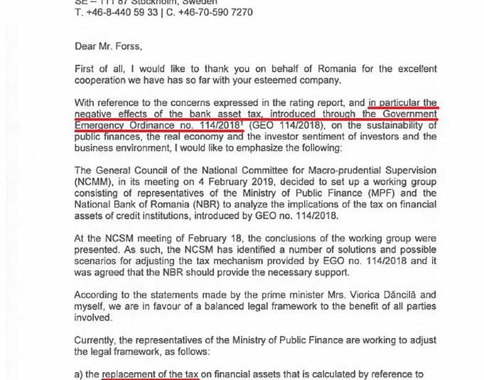 "Ratingul României a scăzut din cauza OUG 114. Autoritățile mint când spun că ratingul României a scăzut din cauza lipsei bugetului" a scris Năsui pe facebook.Deputatul a postat paginile 1 şi 3 (ultima) din document, în care Eugen Teodorovici le explică celor de la Standard and Poor's ce măsuri are în vedere pentru corectarea unor inadvertenţe. Astfel, ministrul Finanţelor spune că taxa pe activele financiare calculată în funcţie de ROBOR ar putea fi înlocuită de o taxă fixă, iar din baza de calcul ar putea fi eliminate câteva categorii de active.