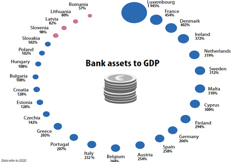 Pur și simplu, sistemul bancar din România are o rentabilitate mai mult decât dublă față de media europeană și de trei ori mai mare decât în Germania sau Franța. Cu alte cuvinte nu există bănci mai profitabile pe acest continent decât băncile de la noi! Și atunci, dacă aici se câștigă asemenea profituri, de ce oare, ne-am întreba noi, de ce nu se extind activele acestor bănci, adică de ce nu oferă mai multe credite? Păi uite de-aia: pentru a rămâne țara cu cele mai puține credite date, adică cu cel mai mic aport al activelor bancare la PIB: