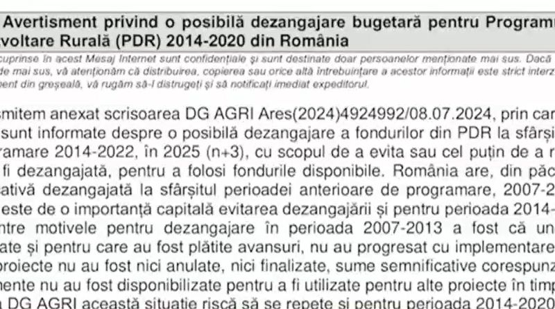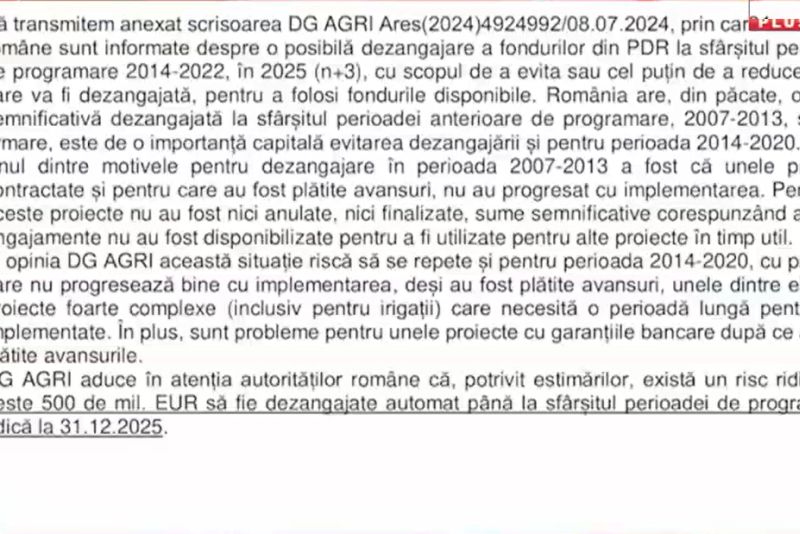 "DGI Agri aduce în atenția autorităților române că, potrivit estimărilor, există un risc ridicat ca peste 500 de milioane de euro să fie dezangajate AUTOMAT până la sfârșitul perioadei, adică 31.12.2025", se arată în documentul prezentat în exclusivitate la Realitatea Plus.