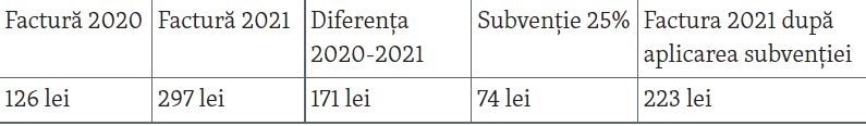 Pe o piață liberalizată, chiar și estimarea valorii facturilor de la iarnă este dificilă, spune Laurențiu Urluescu de la Asociația Furnizorilor de Energie din România (AFEER). În conferința organizată joi de Expert Forum, acesta a prezentat totuși o simulare a evoluției facturilor pentru București, folosind datele furnizorilor cu preț fix.Față de anul trecut, tariful de furnizare, care reprezintă 70% din factură, a crescut cu 320%. Acest lucru înseamnă, a explicat Laurențiu Urluescu, un impact în factură de 236%, deci o factură care va fi de aproape două ori și jumătate mai mare, scrie europalibera.orgDacă factura din 2020 era de 126 de lei, ea va ajunge în 2021 la 297 de lei (fără TVA), cu 171 de lei mai mare.Din aceasta însă, ar urma să se scadă 75 de lei, reprezentând subvenția promisă de Ministerul Energiei. În final, majorarea față de anul trecut la consumator, după aplicarea valorii subvenției, este în acest calcul de 97 de lei.