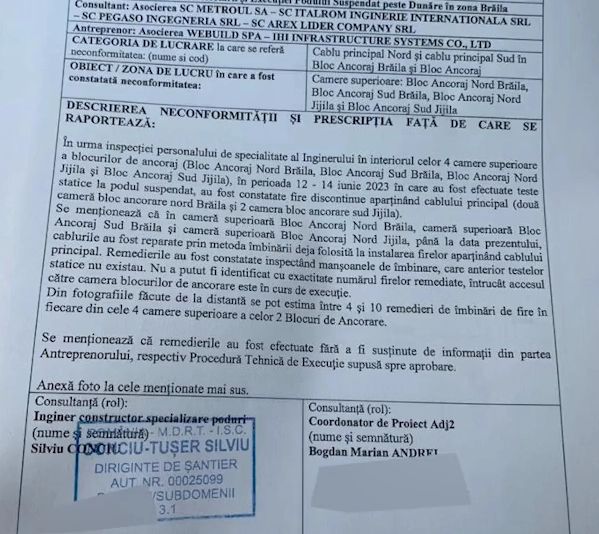 În "RAPORT DE NECONFORMITATE" din 15 iunie 2023, întocmit în urma inspecției unor ingineri în cele 4 camere superioare ale blocurilor de ancoraj în care au fost efectuate teste statice (...) au fost constatate fire discontinue aparținând cablului principal .