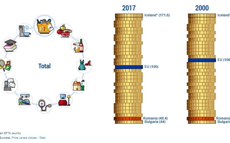 Prețurile din România "au recuperat" în 17 ani 13 puncte procentuale față de media UE, până la 48%, și de șase luni suntem pe primul loc la rata inflației.Între țările membre ale Uniunii Europene există diferențe mari în privința prețurilor la bunuri de consum și servicii.Danemarca și Luxemburg (ambele cu 41% peste media UE) au cele mai ridicate niveluri ale prețurilor la aceste două capitole, potrivit datelor Eurostat pe anul 2017.Pe locurile următoare se află Suedia (35% peste), Irlanda (28% peste), Finlanda (23% peste) și Marea Britanie (17% peste).Cele mai mici niveluri sunt înregistrate în Bulgaria (56% sub media UE), România (52% sub), Polonia (47% sub), Ungaria (42% sub) și Lituania (40% sub media Uniunii Europene).La o privire mai detaliată, Danemarca a fost anul trecut cea mai scumpă țară UE la capitolele "restaurant și hoteluri" (cu prețuri de 51% peste media UE), "hrană" (50% peste), "recreere și cultură" (48% peste), "transport" (28 % peste) și "echipamente de uz casnic" (20% peste).Irlanda a fost cel mai scump stat membru la "băuturi alcoolice și țigări" (74% peste), Luxemburg la "întreținere, apă, gaz, electricitate" (63% peste), Grecia la "comunicații" (54 % peste), Suedia la "îmbrăcăminte și încălțăminte" (34% peste media UE).[caption id="attachment_11546" align="alignnone" width="908"]