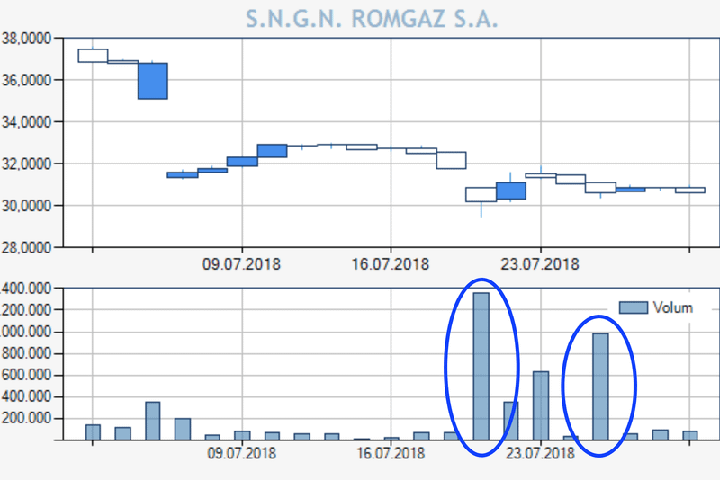 La nivelul închiderii din 30 iulie, de 30,65 de lei, acțiunile Romgaz mai au încă de recuperat față de nivelul de dinaintea publicării acelei inițiative legislative, de 31,8 lei. Nu este foarte mult, 3,75%, dar nici foarte puțin, dacă ținem cont de faptul că investitorii, în general, încă au suspiciuni în privința retragerii pe termen lung a inițiativei legislative.Acesta este semnul ca unii din cei ce au vandut pe știrea negativă ulterior nu a mai revenit pe ordin de cumpărare nici măcar când cotația ajunsese la minimul zilei. Pentru mulți din cei ce au vândut ca să evite o prăbușire a cotațiilor SNG este foarte probabil ca aceasta să fie o pierdere care să îi fi marcat în asemenea măsură încât să renunțe definitiv la acest emitent.Ceea ce este interesant este faptul că, dacă în puseul inițial de vânzare, volumele au fost cele care au atras atenția cel mai mult, am putut constata că instituționalii presupuși a fi vândut atunci este foarte probabil să-și fi refăcut portofoliile în sesiunea din 25 iulie, asa cum se poate constata și din graficul următor.