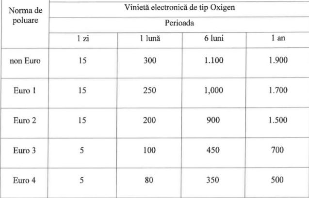 500 lei (euro 4), 700 lei (euro 3), 1.200 (euro 2), 1.700 lei (euro 1) și 1.900 lei (non-euro)