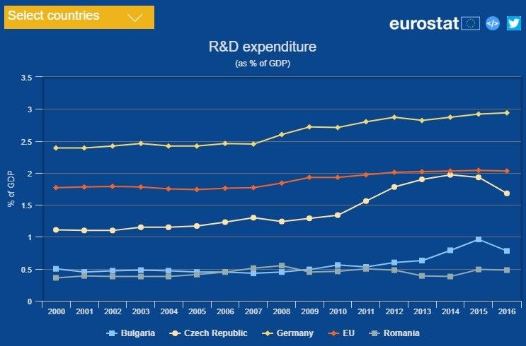 Sursa: Eurostat[/caption]În acest interval, media UE (cu roșu în grafic) a evoluat de la 1,77% la 2,03%. Germania (cu galben), cea mai dezvoltată țară din Uniune, aloca domeniului de cercetare-dezvoltare 2,39% din PIB în 2000 și a atins 2,94% în 2016.Cehia (cu alb), una dintre țările foste comuniste, a pornit de la 1,11% în 2000 și a ajuns la 1,68% în 2016, după ce în 2014 egalase media UE (2,04%).România (cu gri) are cifre foarte mici la acest capitol – 0,36% din PIB în 2000, respectiv 0,48% în 2016.Ne întrece și Bulgaria (cu bleu) – 0,5% în 2000, respectiv 0,78% în 2016. Aceasta deși, de-a lungul perioadei, au existat ani când România a alocat mai mulți bani decât Bulgaria pentru cercetare-dezvoltare.Nici perspectivele nu sunt prea îmbucurătoare. Ministrul Cercetării şi Inovării, Nicolae Burnete, a declarat recent, la Comisia pentru învăţământ a Camerei Deputaţilor, că bugetul alocat cercetării este absolut insuficient."Cunoaşteţi ţinta de 2% din PIB, bani alocaţi cercetării, din care 1% din fonduri publice şi 1% din fonduri private. În 2018, bugetul alocat cercetării este de 1,6 miliarde lei, ceea ce înseamnă un procent mai mic decât ne dorim din PIB", a spus Burnete, citat de Agerpres.Comisia Națională de Strategie și Prognoză estimează pentru 2018 un PIB de 945 miliarde de lei, astfel că suma de 1,6 miliarde de lei ar reprezenta circa 0,17% din PIB, la care ar urma să se adauge și finanțările private."Ştiu foarte bine că atât în Europa, cât şi în Statele Unite, cât şi în Japonia, enorm de multe din rezultatele fenomenale din cercetare sunt obţinute de români. Şi este normal să mă întreb dacă nu-i putem angaja pe aceşti concetăţeni să facă acelaşi lucru şi pentru ţara mamă. Cred că în România se poate dezvolta cercetarea mult mai bine. Da, bugetul este absolut insuficient în acest moment, ăsta este bugetul. Noi ne-am făcut calcule, ne gândim la o rectificare bugetară pozitivă", a mai spus ministrul Cercetării.