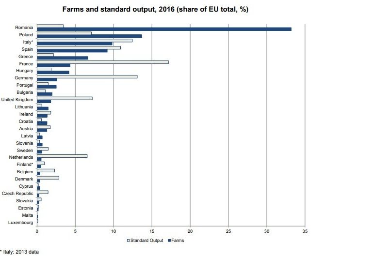 În UE activează circa 10,3 milioane de ferme agricole. Două treimi din acestea acoperă mai puțin de 5 hectare fiecare, în timp ce 3% dintre ferme se întind pe suprafețe de peste 100 hectare.Doar 11% din managerii fermelor au vârste sub 40 de ani, în timp ce 32% au peste 65 de ani.România deține o treime (33%) din fermele agricole ale Uniunii Europene (suntem lideri în clasament), dar majoritatea dintre acestea operează pe suprafețe mici. Pe locul secund la acest capitol se situează Polonia, dar la mare distanță (14% din totalul fermelor), urmată de Italia (10%) și Spania (9%).[caption id="attachment_5009" align="alignnone" width="872"]