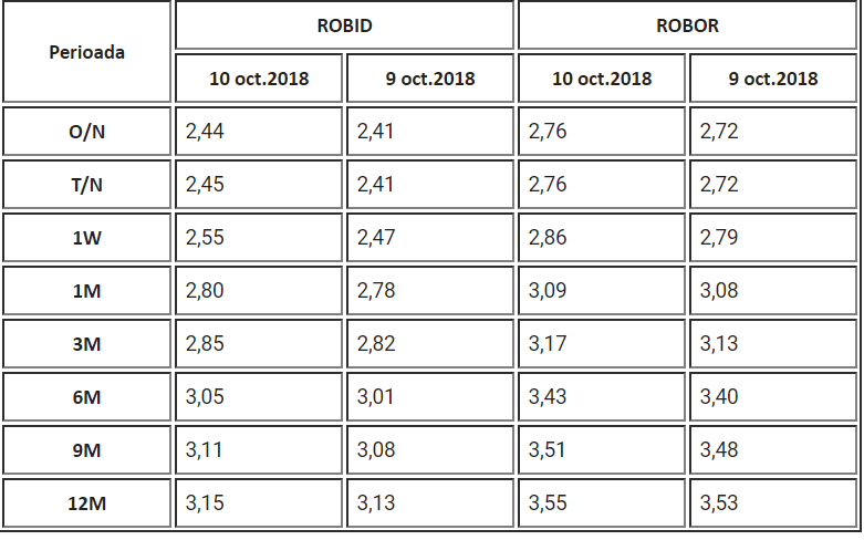 ROBOR și-a luat din nou avant crescând la toate termenele. Explicația este că BNR nu a mai mai oferit lichiditate din piață prin operațiuni de tip repo.Azi ROBOR este pe plus absolut toate toate termenele după ce în ultima perioadă tot prin intervențiile din piață BNR dăduse în jos acest indicator (ROBOR 3 M - dobânda la trei luni este în mod obișnuit dobânda de referință pentru creditele acordate în moneda națională).ROBOR reprezinta rata dobânzii la depozitele plasate de către bănci în piața bancară și este calculată de Reuters. Nivelul ccalculat, azi, pentru ROBOR 3 M este 3,17% fașă de 3,13% în ziua de marți.Același nivel s-a mai înregistrat cel mai recent pe data de 28.09.2018 fiind însă sub pragurile maxime atinse din ultimii ani. La începutul lunii august RORBOR 3M se apropiase de 3,5%, nivelul ridicat al inflației de 5% atrăgând după sine și salutul acestui indicator.Operațiunile repo sunt tranzacţii reversibile, destinate injectării de lichiditate, în cadrul cărora BNR cumpără de la instituţiile de credit active eligibile pentru tranzacţionare, cu angajamentul acestora de a răscumpăra activele respective la o dată ulterioară şi la un preţ stabilit la data tranzacţiei;Operațiunile de piață monetară se realizează la iniţiativa băncii centrale, având următoarele funcţii: ghidarea ratelor de dobândă, gestionarea condiţiilor lichidităţii de pe piaţa monetară şi semnalizarea orientării politicii monetare.În tabelul de mai jos, în coloanele din dreapta se regăsesc dobânzile ROBOR pentru ziua de azi (ultima coloană din dreapta sunt procentele consemnate ieri, 9 octombrie).