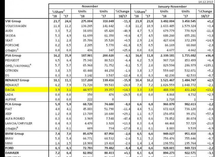 În primele 11 luni din acest an, livrările de autoturisme Dacia au consemnat o creştere de 13,2% în Europa, iar cota de piaţă a producătorului de automobile a urcat la 3,3%, de la 3% în perioada similară din 2017