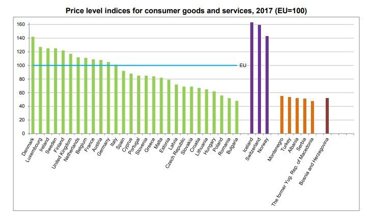 Danemarca, lider în top. Prețurile la bunurile de consum și servicii au variat anul trecut, în țările Uniunii Europene, pe o plajă largă, cu diferențe mari între cele mai mici și cele mai ridicate niveluri.Danemarca a avut în 2017 cele mai mari prețuri (142% fața de media UE), fiind urmată de Luxemburg (127%), Irlanda și Suedia (ambele cu 125%), Finlanda (122%) și Marea Britanie (117%), informează un comunicat publicat miercuri de Eurostat.La polul opus, cu cele mai mici prețuri, se află Bulgaria (48%), România (52%) și Polonia (56%).
