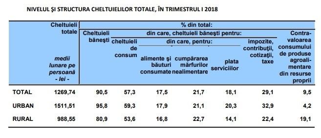 După ce își plătește mâncarea și curentul electric, românul rămâne cu prea puțini bani pentru investiții, care însumează doar 0,3% din cheltuieli.Veniturile totale medii lunare au reprezentat în trimestrul I 2018, în termeni nominali, 3.873 lei pe gospodărie şi 1.483 lei pe persoană, potrivit unui comunicat publicat vineri de Institutul Național de Statistică.Cheltuielile totale ale populaţiei, au fost, în trimestrul I 2018, în medie, de 3.317 lei lunar pe gospodărie (1.270 lei pe persoană) şi au reprezentat 85,6% din nivelul veniturilor totale.Veniturile băneşti au fost, în medie, de 3.505 lei lunar pe gospodărie (1.342 lei pe persoană), iar veniturile în natură de 368 lei lunar pe gospodărie (141 lei pe persoană).Salariile şi celelalte venituri asociate lor au format cea mai importantă sursă de venituri (64,6% din veniturile totale ale gospodăriilor). [caption id="attachment_5682" align="alignnone" width="624"]